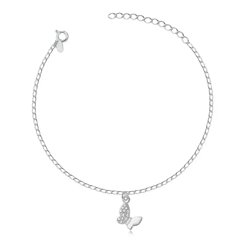 Tornozeleira de prata 925 elos com pingente de borboleta com zircônias brancas.